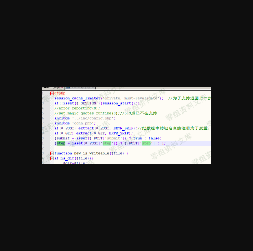 分析代码可以知道,setp为空的时候,初始化初始化的变量1,然后进入到step_1.php,有install.lock,就不能重装,所以我们这里直接POST step = 2绕过