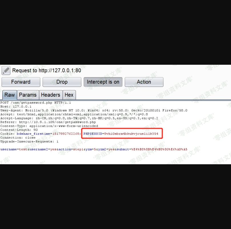 第一步先在找回密码页面输入要修改的用户名,点击下一步,burp拦截。