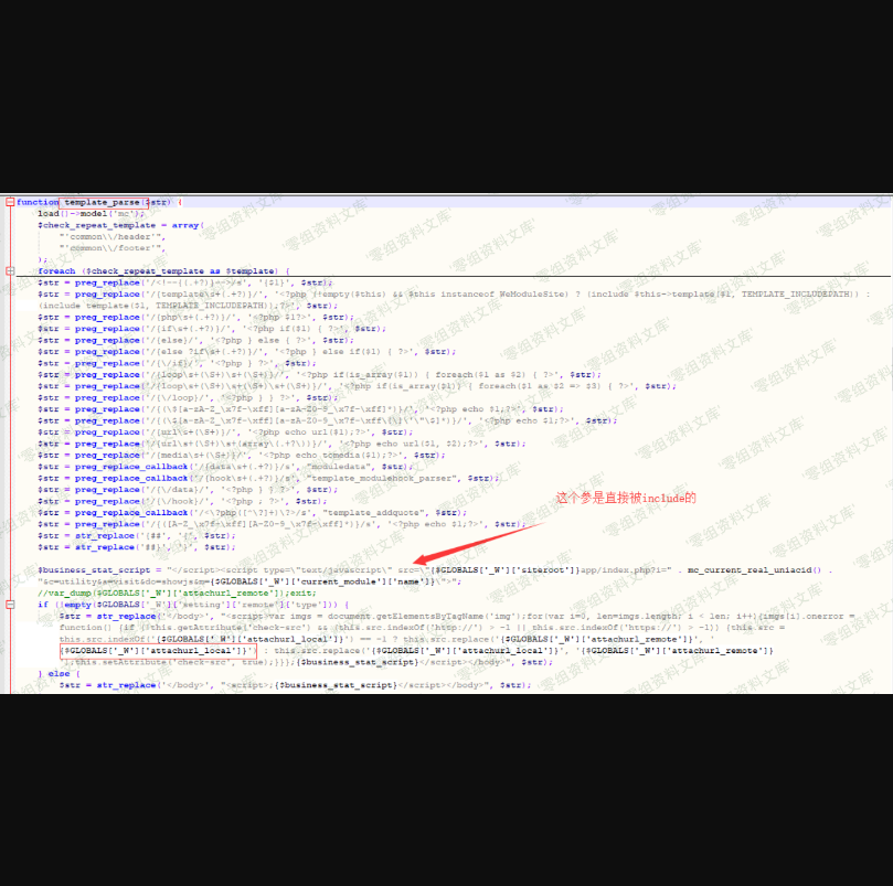 这个洞首先需要一个高权账号。问题出在模板解析这里(template.func.php)。